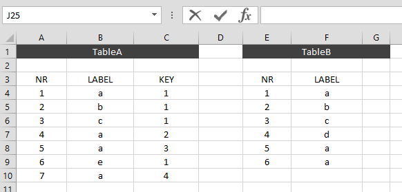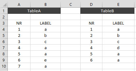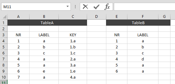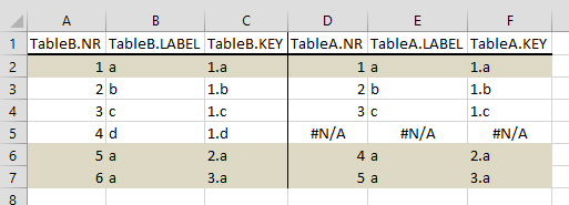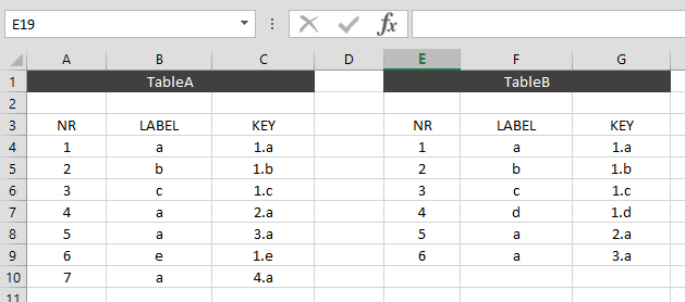 In the results worksheet you see that the first value of “a” in TableA is matched with the first value of a in TableB and so on for the rest.