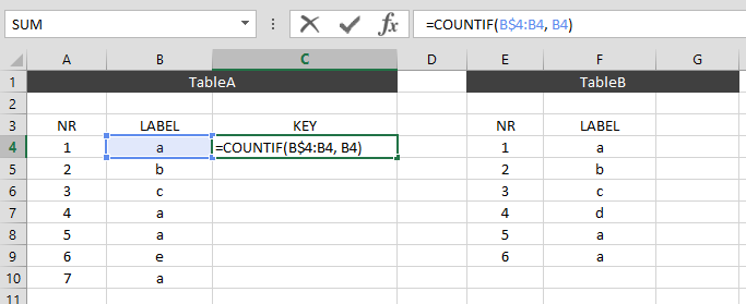 Next you need to make the results of the KEY column related to the corresponding values. We do this by just concatenating the KEY values with the LABEL corresponding values. Edit the formula in cell C4 and copy it in the following cells to replace the old formula with the new edited one.