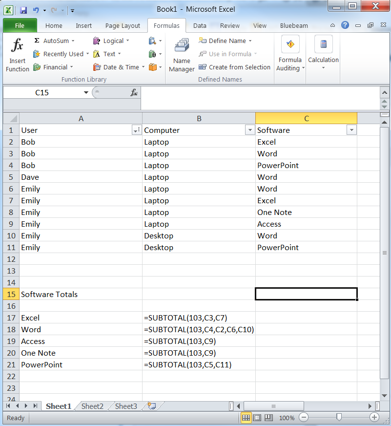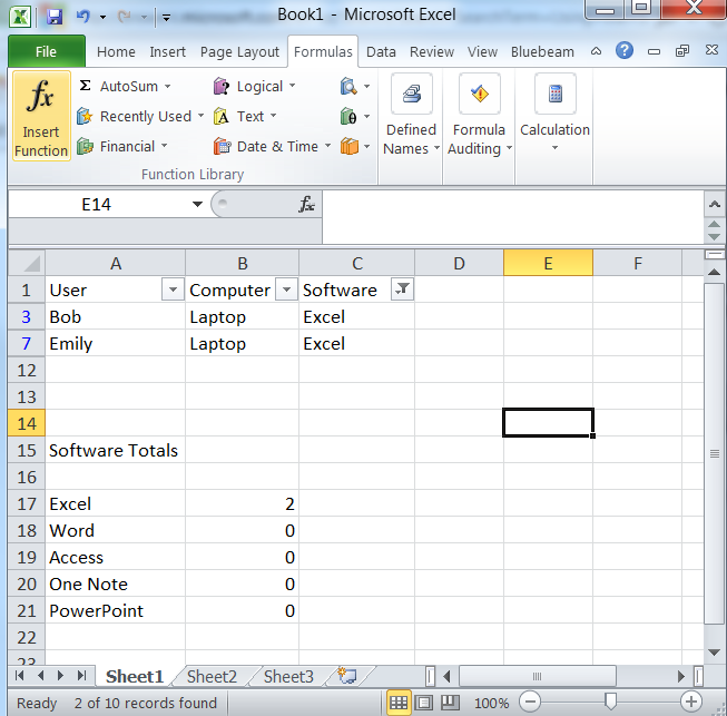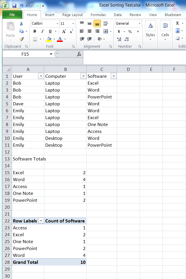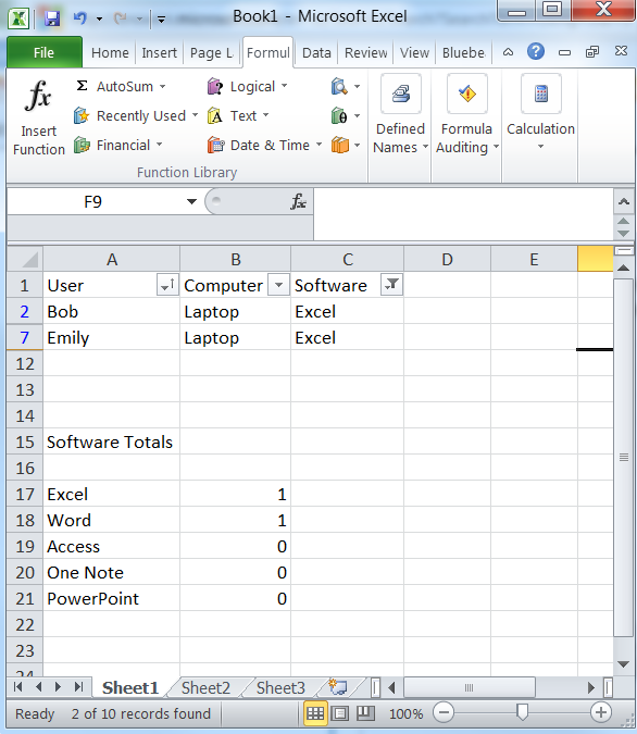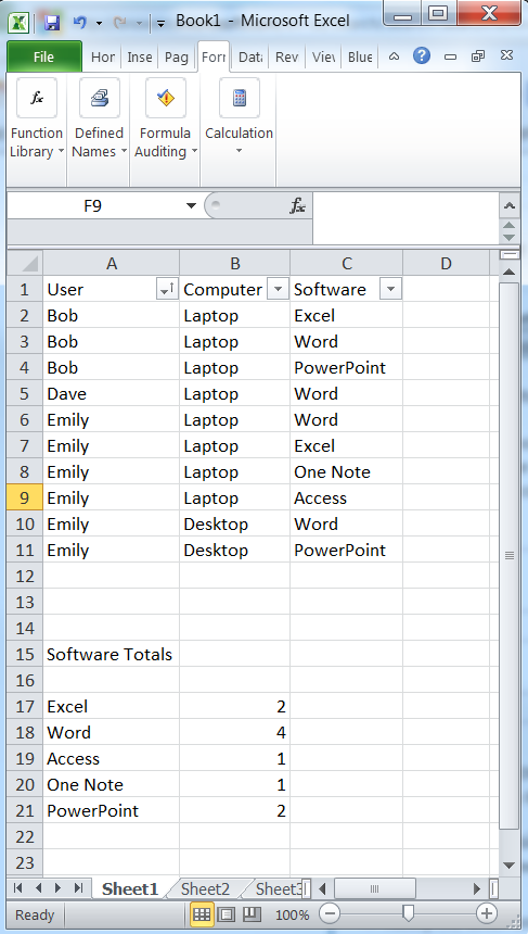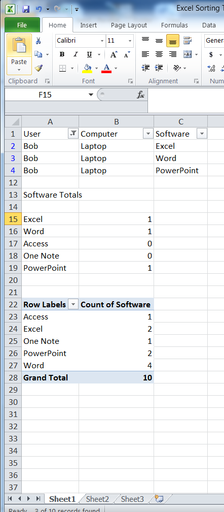 Ex: lets say I just want to see Bob's software count, so I fiter the "User" Column to "Bob":