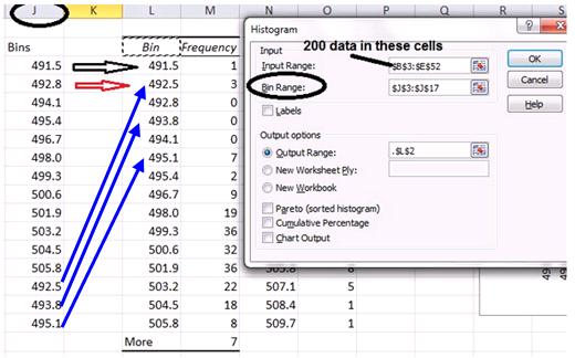 I am teaching a statistics class in which one of the exercises is to create a histogram using the bins in column J of this spreadsheet. Somebody got the following results, and I got the SAME results when I ran the histogram routine on his spreadsheet. Note that the second bin value does not match the one (492.8) in the input range, and then the others don't either.