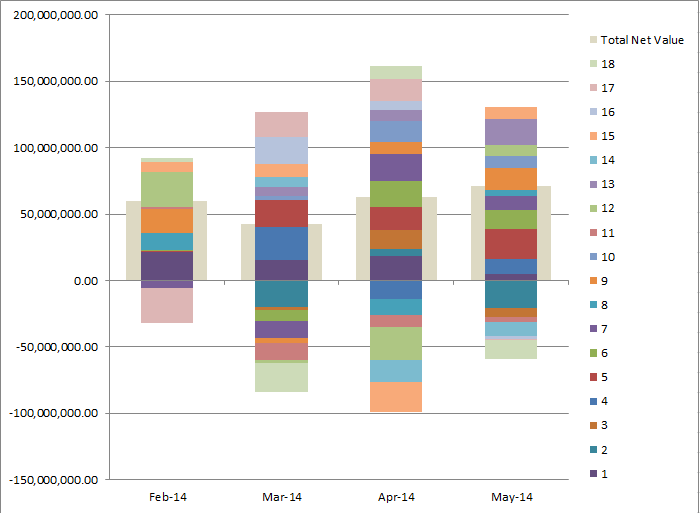 I'd like to bar chart a data range that is similar to the one listed below. While charting the details from 1 to 18 is simple, I am having difficulties in including the total net value of $60,141,291.31 in the same chart. Could someone please advise if charting the net value along with the positive and negative details is possible? If so, may I have step by step instruction please? FYI, I'm using Excel 2010 and the real data has multiple months.