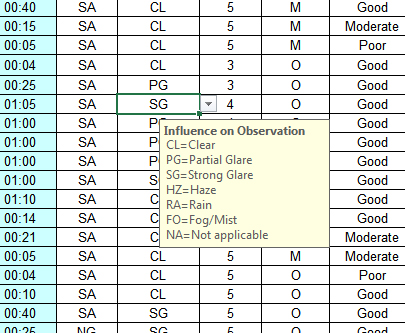 I'm trying to design an excel spreadsheet where cells in various columns are populated by choices from a drop-down validation list. The options in the validation list are (for example) 1, 2, 3 and 4; where 1 = excellent, 2 = very good, 3 = good and 4 = not great. I want to be able to sum across columns so it's important that only the numeric values are included in each cell. However, I also need to include information so that a user knows that selecting '1' means that the item was 'excellent'. I have seen this done by way of a drop-down list for the cell values and a type of text box that appears when a cell is selected. But I cannot figure out how they did it. See the screenshot below for an example of what I mean.