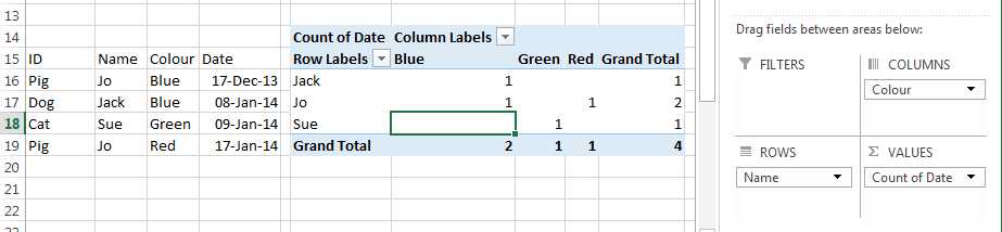 Then in a Pivot table you can have Name in Rows, Colour in Columns, and count of date in Values: