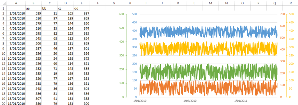 I would like to be able to do this in Excel where vertical axis marks are "stacked" and color coded to the lines on the graph.