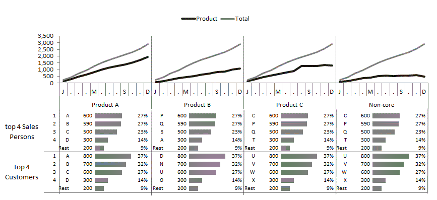 In fact the four line charts you see above are just "one" chart in Excel. They look like 4 charts that have been placed beside each other, but they are not. To see how to create this from scratch, check out this Link.