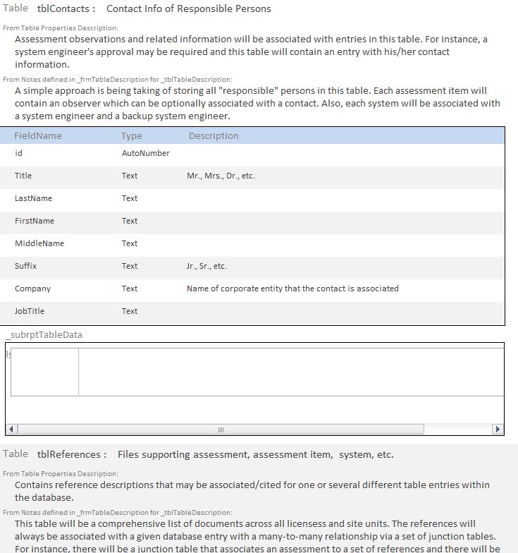 1. Yes, I did look at the documenter. Although it provides good technical details it does not appear to pull in the field descriptions or the table description from the properties. I may be missing something; so, please confirm that this is the case. Also, I create my own form for descriptive information on a per table basis which is comfortable for the documentation phase. Here is a snippit from my report on a couple of general tables being reported on (with the empty box being my unsuccessful attempt to pull in example data) ...
