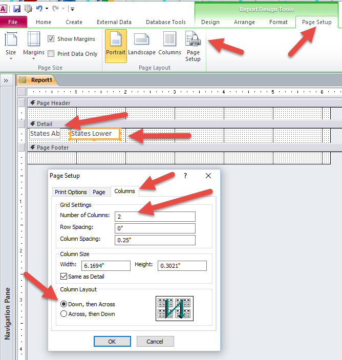 There is another arrow pointing to the Detail band of the report. Controls are objects placed on a report that may or may not be bound to fields in a table. In this case the report is bound to a table of US States and I placed two controls for the state abbreviation and name. Below the Page footer is the Page Layout dialog displaying the Columns tab. Not that I have it set for 2 Columns and the layout for Down then Across. Note, I forgot to change the Column Width, it should be about half the page width.