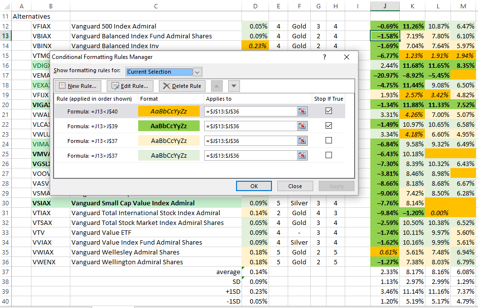 So, while your suggesting didn't fit it directly, it did get me on the right path -- suspecting that the format of the numbers was somehow to blame. I reformatted from Percentage to Number, and only the positive numbers switched format. The negative numbers still showed as percentages. I fixed the problem by retyping the negative numbers (they had been copied off the Vanguard website and pasted into Excel). Not sure why that was an issue, but at least I have a solution.