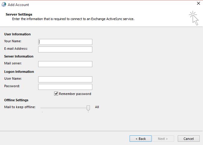 When your AutoDiscover service has been configured correctly on the Exchange server, all you have to provide in Outlook would be your name, email address and password and Outlook will configure itself without the need to manually alter something.