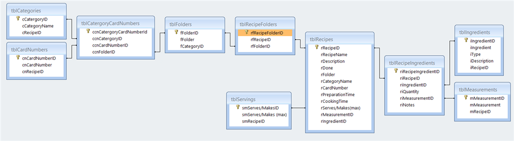 When you go into 'Recipes.accdb', there is 'tblRelatedRecipes' which is not in the flowchart. (It holds three fields: 'rrID', 'rrRecipeID', 'rrRelatedRecipeID')