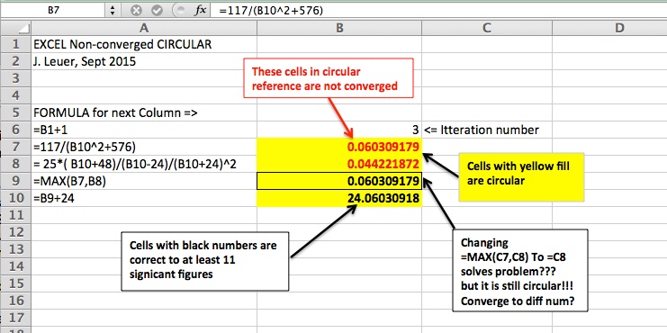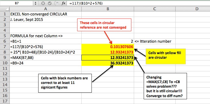 It seems the algorithm now in excel for circular references does not correctly update cells from circular references which depend on the outcome of the circular reference. This is a major bug in the formulation and one I have not ever seen in my many years of using excel.
