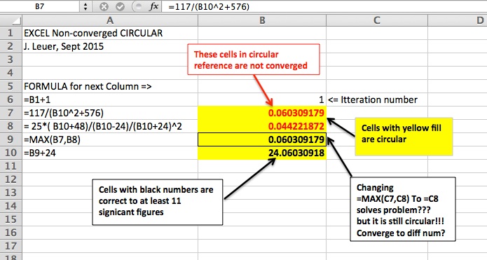 All formulas associated with the circular reference are correct to at least 11 significant decimals
