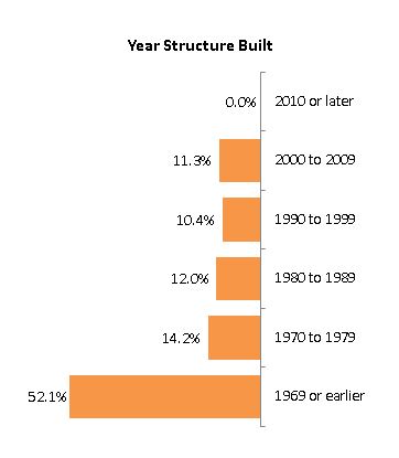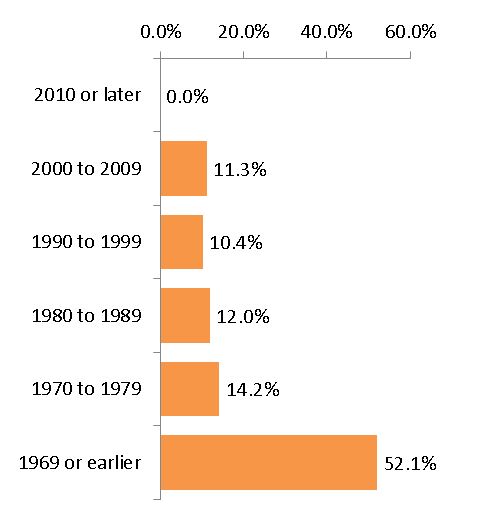 Below you can see that the first category of "2010 or later" has a value of 0.0%, which is labeled to the right of the Y axis.