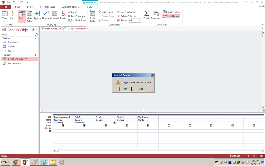 2016-04-14T19:38:27+00:00 My guess is that your join between the donations and donors tables use different datatypes. The Screen shot doesn't show the tables or the join fields so we can't tell you what fields to check.