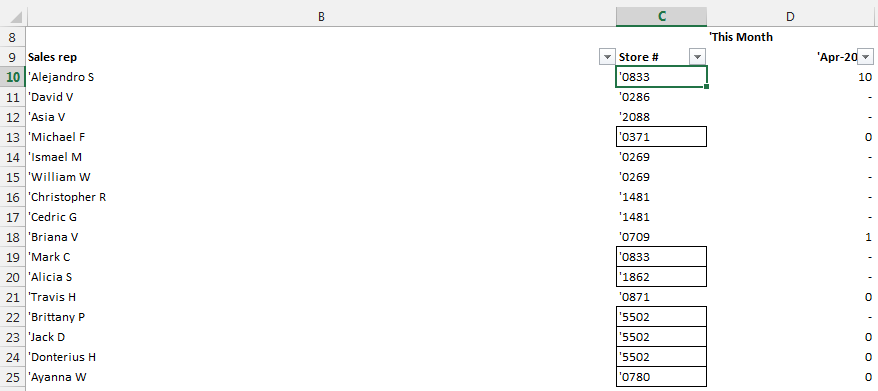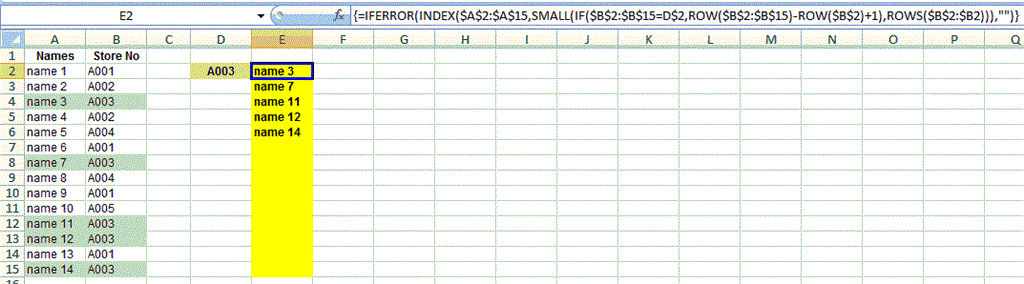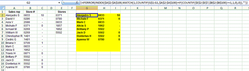I have a list of names in column A with no repetitions. In column B I have a list of store numbers with multiple repetitions, usually 7-8 names per store number. On another worksheet I have a list of the stores I'd like to reference, as I don't want all of the stores or names to feed into my report. I'd like to create a formula that says look for these particular store numbers and give me all the names associated with the store numbers. Any suggestions?
