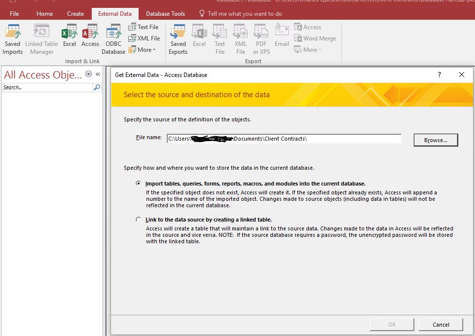 I am still getting the "Microsoft Access does not support opening HTML files" error message when I use the browse button or the Documents folder (see image). As mentioned in an earlier post, I need to get this working so I can use the