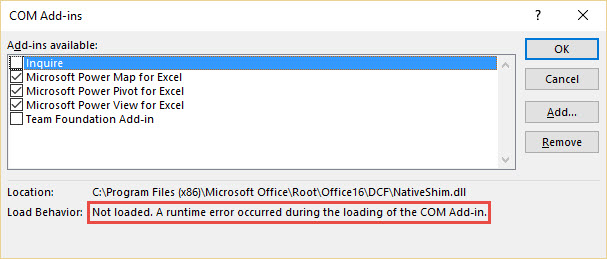 Excel 2016 - Com Add-In: Inquire - Not loaded. A runtime error occurred during the loading of the COM Add-In