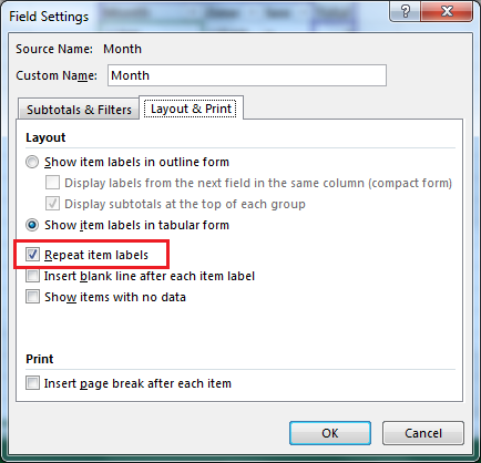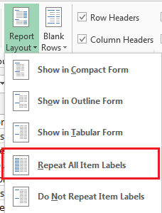 - Design Tab > Report Layout > Repeat All Item Labels (This will repeat item labels for all items)