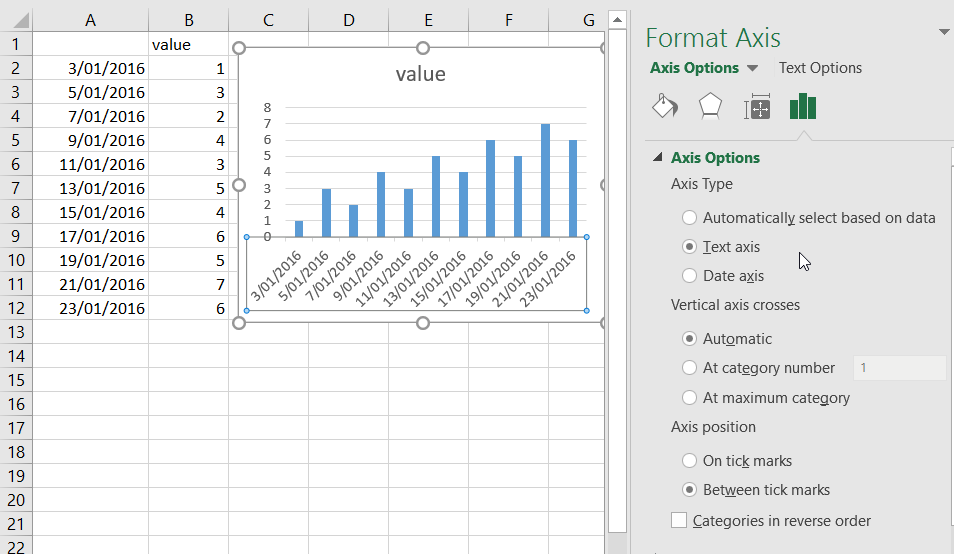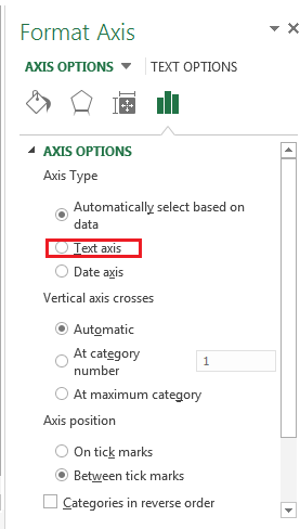 Right click on x axis > Format Axis >Choose Text Axis