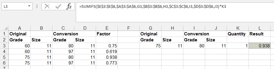 The formula in L3 then gets the unique 'Factor' and multiplies by the quantity in K3.