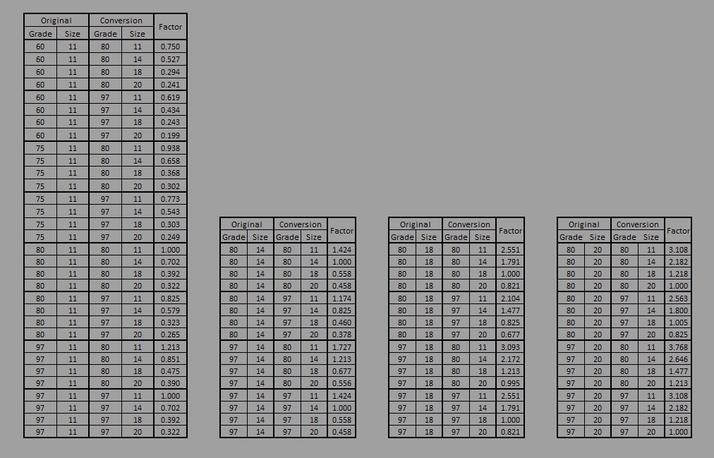 Columns A:E represent your conversion table as shown in the picture. Arrange them in one table in rows down the page.