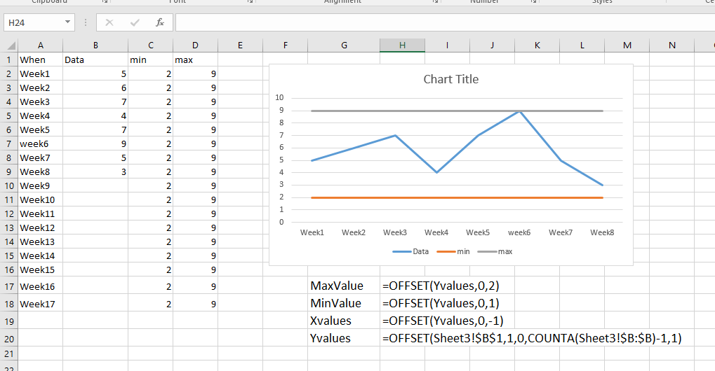 how do u plot upper limit and lower limit in a line chart? i am using a dynamic range in that chart(using offset function). i tried plotting the limits as a line chart but that doesnt work for my case. for example say -2 to +2 is my limits. i wont be able to enter the limits each and everytime when my user records data but if i enter my limits as -2 to +2, that chart should show up a flat line in the chart at -2 and +2.