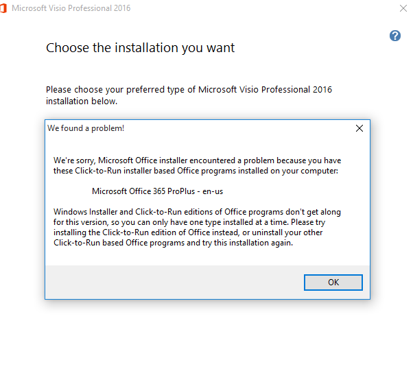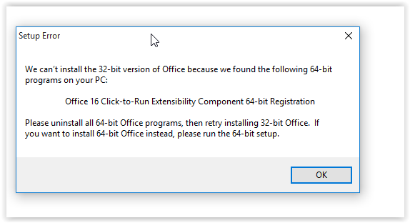 I went to install Project 2016 from MSDN and I received an error message on the 32-bit version saying I can't install the 32-bit version because, "Office 16 Click-to-Run Extensibility Component 64-bit Registration" is installed. It wants me to uninstall