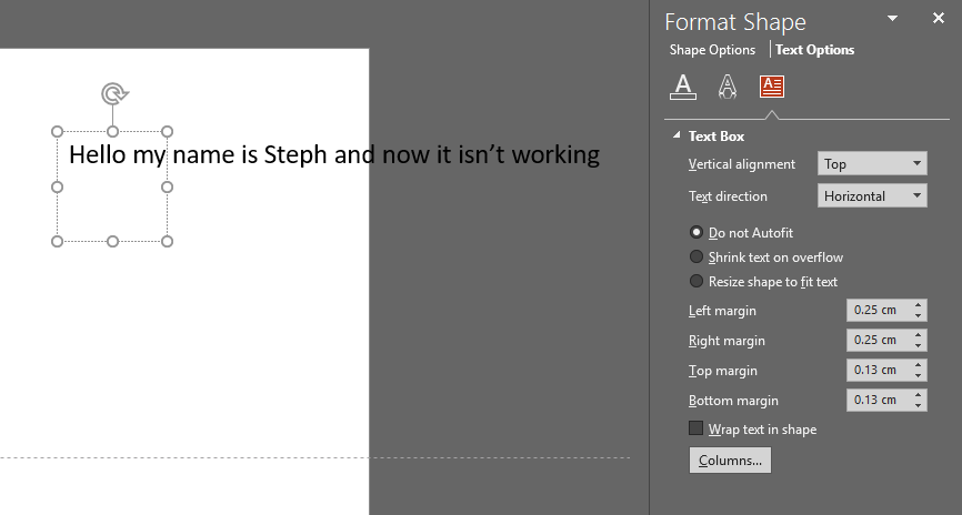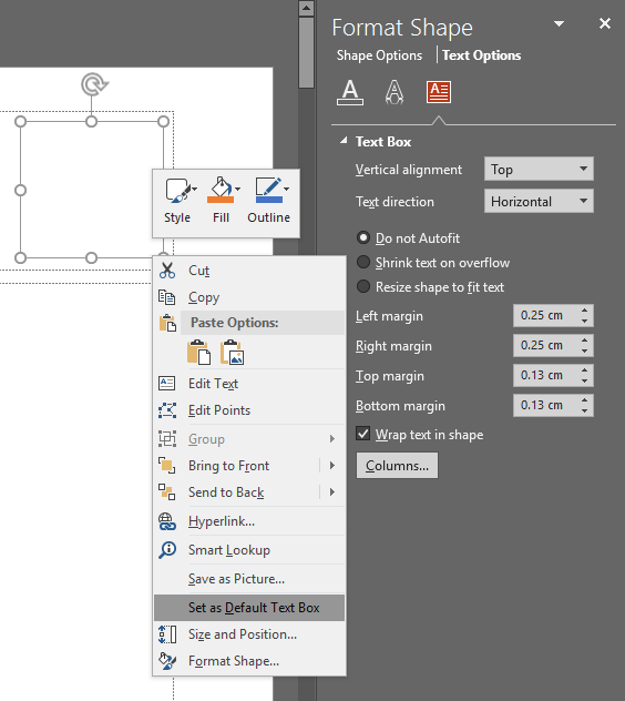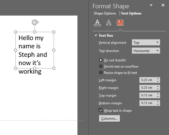 Finally, do any of you lovely people know how to set it to ALWAYS Wrap text in shape, regardless of how you insert the text box onto the slide?