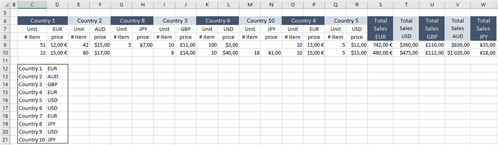 In the example, I'd like to show the sum of (number of units sold*price per unit) for all countries, sorted by currency (col. D, F, H) ; the presentation is shown as such because prices may vary between countries.