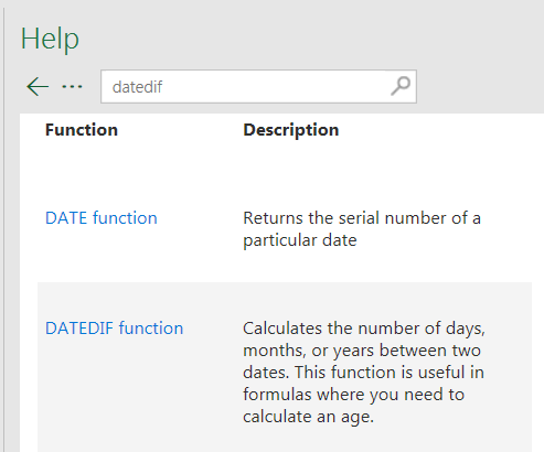 DATEDIF is not a standard function and hence not part of functions library and so no documentation. Microsoft doesn't promote to use this function as it gives incorrect results in few circumstances.