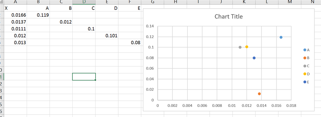 I want to create a scatter chart in Excel with dots only. I want each dot to be one series. Example of my data looks like this: