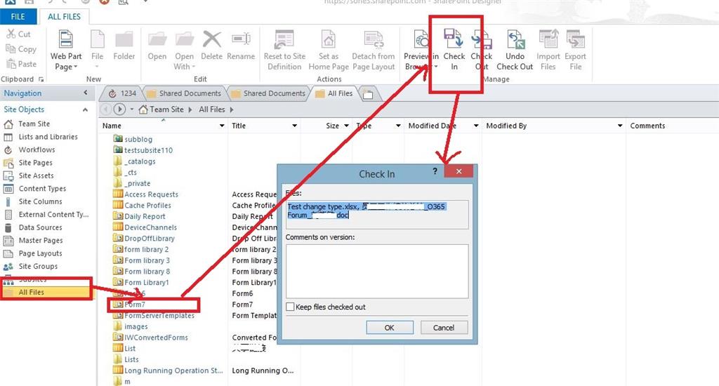 - In SharePoint Designer 2013, click All files in the left panel>choose the library (choose it, don’t access it)>click Check In>OK.