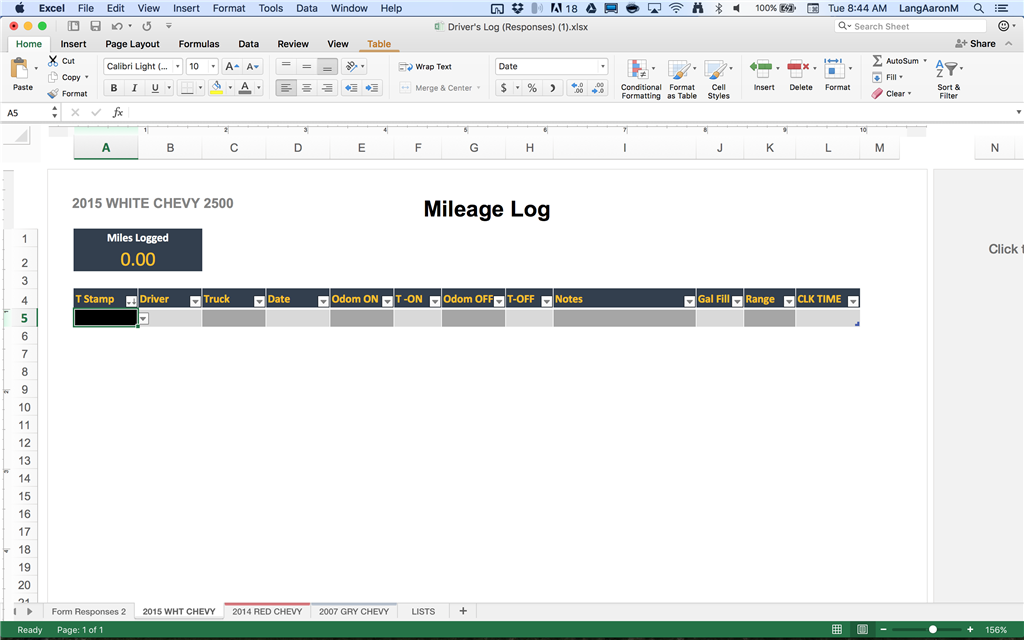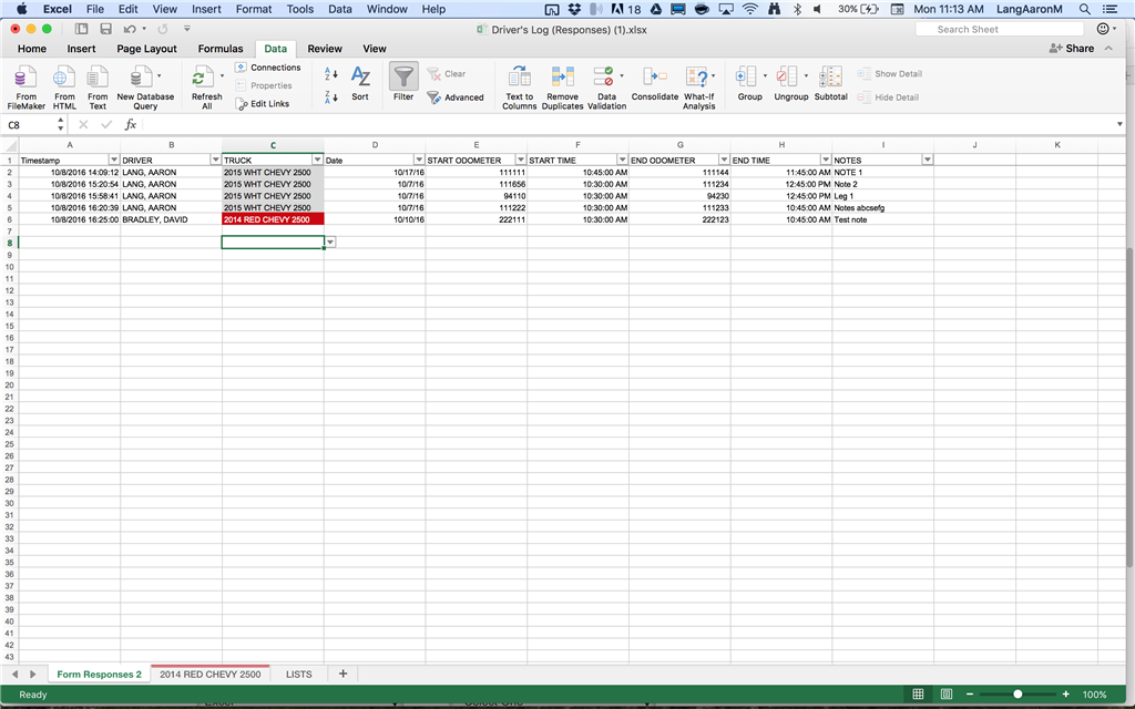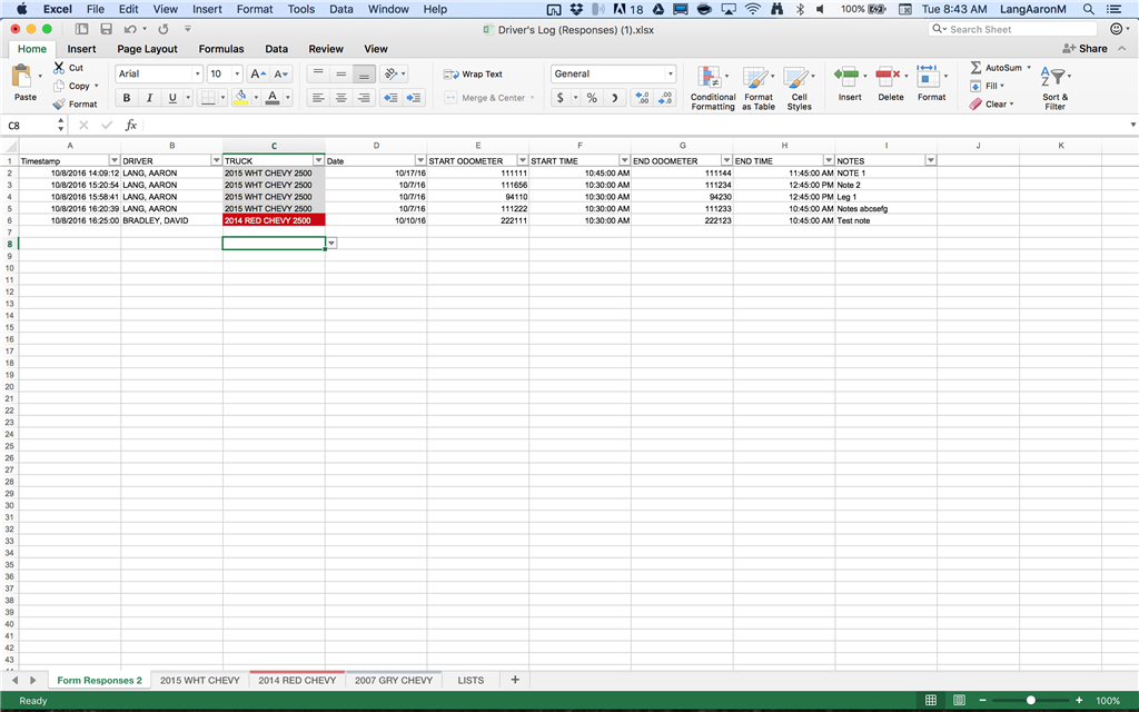 - Here's a screenshot of a both tabs. I edited the truck's tabs for appearances, but they don't need to be formatted this way. Each of the truck tabs are identical, minus title in the headers. I kept the columns the same globally to make it easier. The end goal is to separate all data entered in sheet 1 (auto-populated from an app) onto the nicer looking truck tabs for reporting purposes. If I can get that figured out, I'll do the same by driver at some point as well. Either way, I imagine it would be the same process.