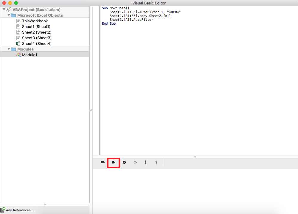 2.    Add the code below. For example, rows which contains RED in Column C in Sheet 1 will be copied to Sheet 2.