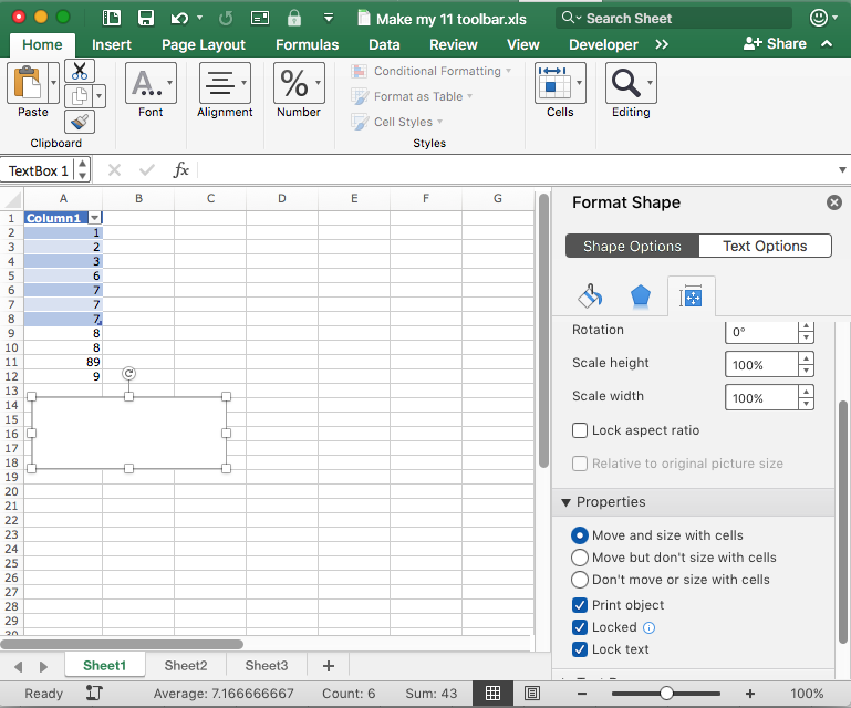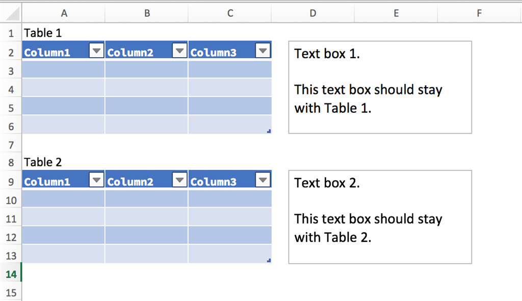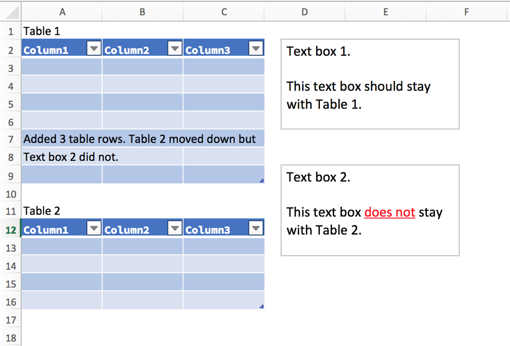 Based on my test, the sheet row is different from table row (“Move but don’t size with cells” selected). When we insert a sheet row, text box will move. However, when inserting a table, the Text Box doesn’t move. As a workaround, you may directly move the Text box to a proper position. You may also firstly insert sheet rows which make text box move, and then create table.