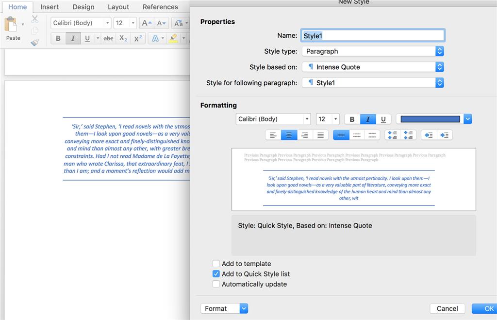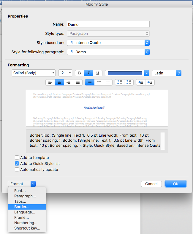 I want to create a new style based on the built-in Intense Quote style; I can change everything about the style except the horizontal rules at the top and bottom of the styled paragraph. Specifically, I wish to change their color from blue to black, but I can find no way to do so. Any help is greatly appreciated.