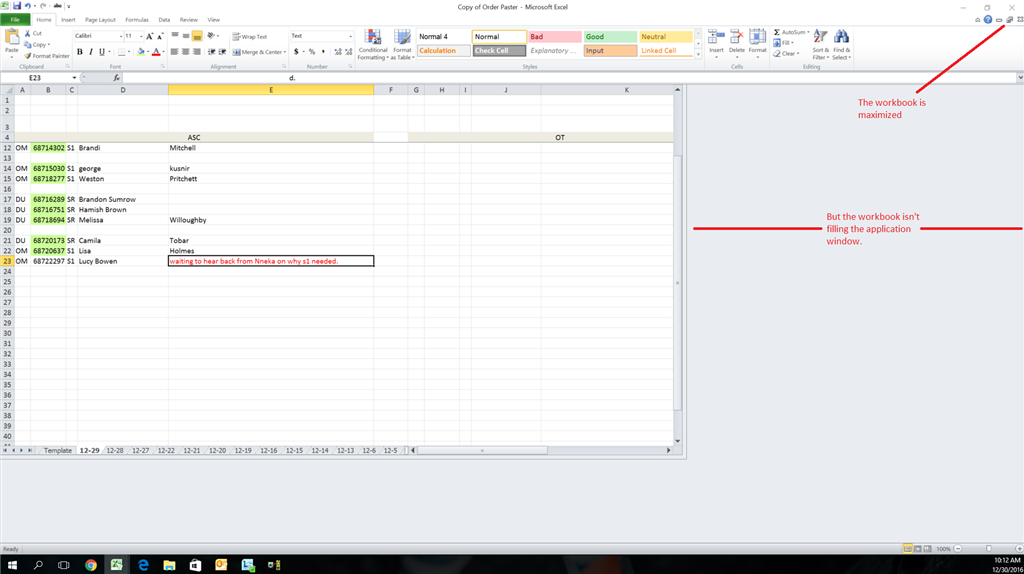 window expands to fill the monitor, but the Workbook window does not expand to fill the application window. Even when maximized, the workbook is still the same size as the laptop monitor (even though the application is sized correctly).