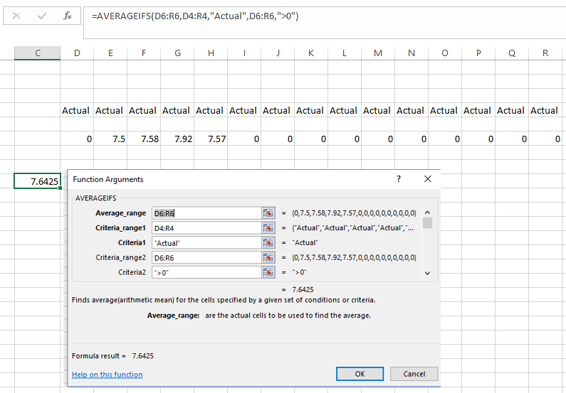 =SUMPRODUCT(--(D4:R4="Actual"), --(D6:R6>0), D6:R6)/SUMPRODUCT(--(D4:R4="Actual"), --(D6:R6>0))