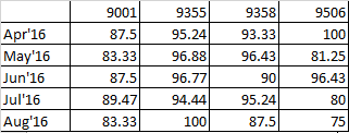 | Aug-16 | 83.33 | 100.00 | 87.50 | 75.00 |