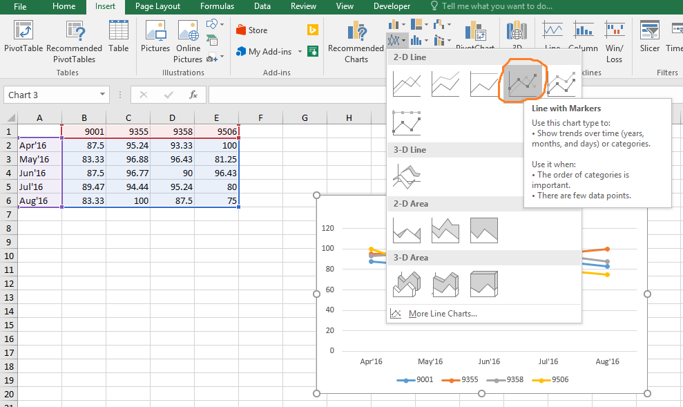 Now got to, "Insert > Chart > Line Chart > Line with Markers" as shown in below: