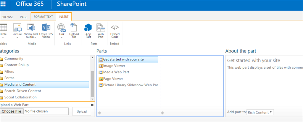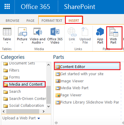 3.Click Insert on the ribbon>Web Part>Media and Content>Script Editor (as shown below)>Add