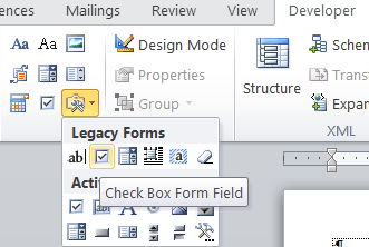 For best compatibility with all versions of Word, use the Legacy Form Field checkbox (Word 2010 menu location shown below), then protect the document for forms: