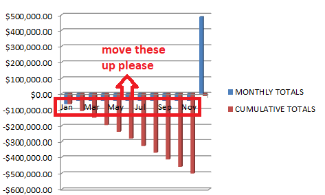 How can I change the position of the horizontal axis labels (i.e. Jan, Feb, Mar,...). They are overlapping with the bars and I think it would look cleaner if they were in a clear area, like above the bars. When I hover over it, a box highlights around it and the mouse cursor transforms into a four-way set of arrows, but when I click and drag, nothing happens.