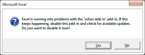 First is the 'solver add-in'. Previously It runs great. But suddenly the error message popped out, saying "Excel is running into problems with the 'solver add-in' add-in...". After I click "No" the excel opens, but when I try to manually add the add-in,