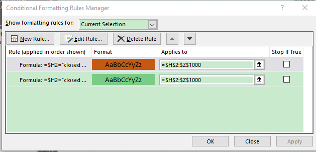 However, no matter how hard I try, I cannot get the same formula to work for a seventh term, "closed profit". I am trying to have the row coloured green when "closed profit" is present, but it always ends up white as above. Here is a screenshot of the relevant rules:
