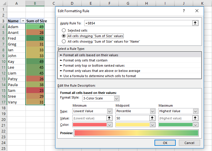 I don't know if Excel for Mac has that feature, but in Excel for Windows, conditional formats on pivot table values have a setting for applying the rule to a pivot table. Edit the rule and at the top of the rule window see if you can spot these "Apply Rule To" options.
