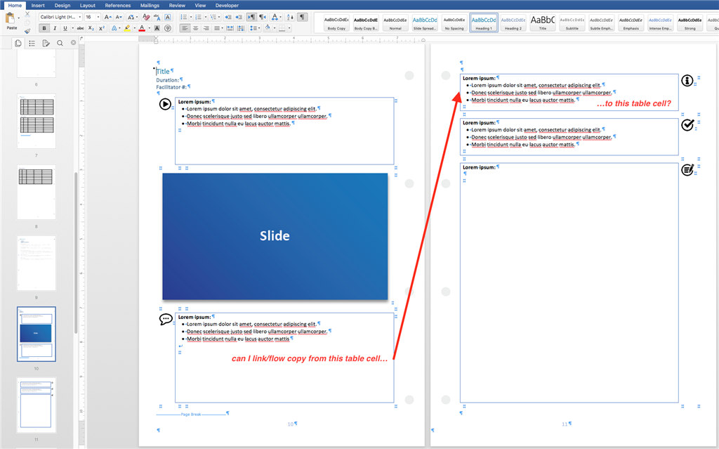 I.e, if the text in one of the table cells at the bottom of page 10 runs long, I'd like it to automatically flow into one of the table cells at the top of page 11. Does that make sense?