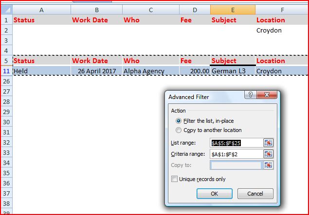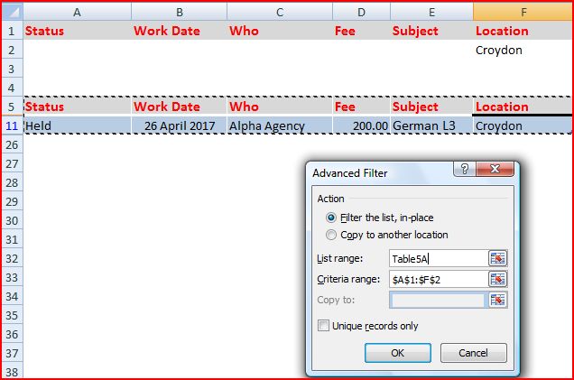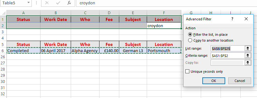 What appears to be happening is that although Excel tells me Table 5 is A5:F25, the Advanced Filter interprets Table5 as A6:F25, i.e. it ignores the header row, so it (i.e. Advanced Filter) "Thinks" line 6 is the header.