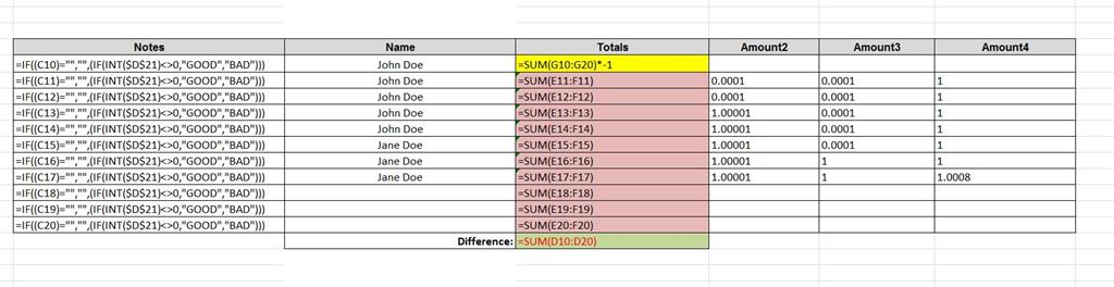 If the Difference amount (cell C21) is NOT ZERO, then the word BAD should display in column B for all rows.