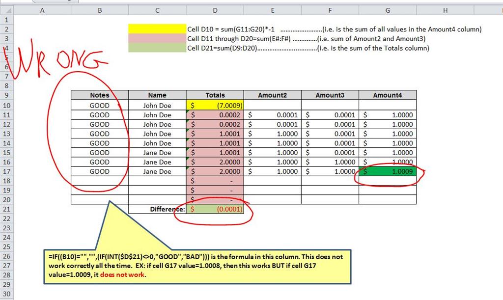 Finally, the reason why D21 does not display -0.0001 and -0.0002 when rounded to 4 decimal places is a quirk of computer binary arithmetic.